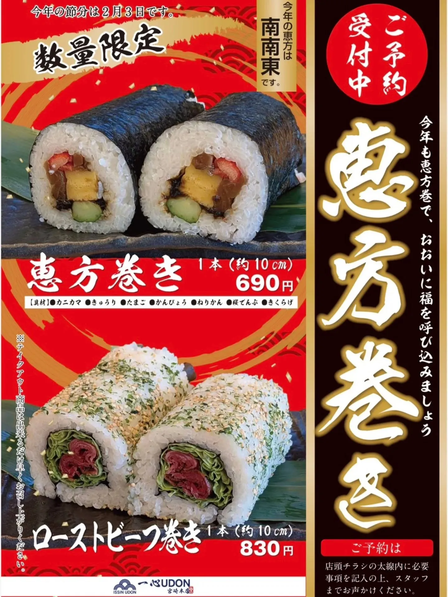 恵方巻の予約開始いたします😁 2026/01/09 恵方巻の予約開始いたします😁 今年はローストビーフ巻きです 数量限定になっております😞 一心UDON宮崎本店 0985-72-3530 #恵方巻#ローストビーフ巻#宮崎うどん#南南東 #一心UDON